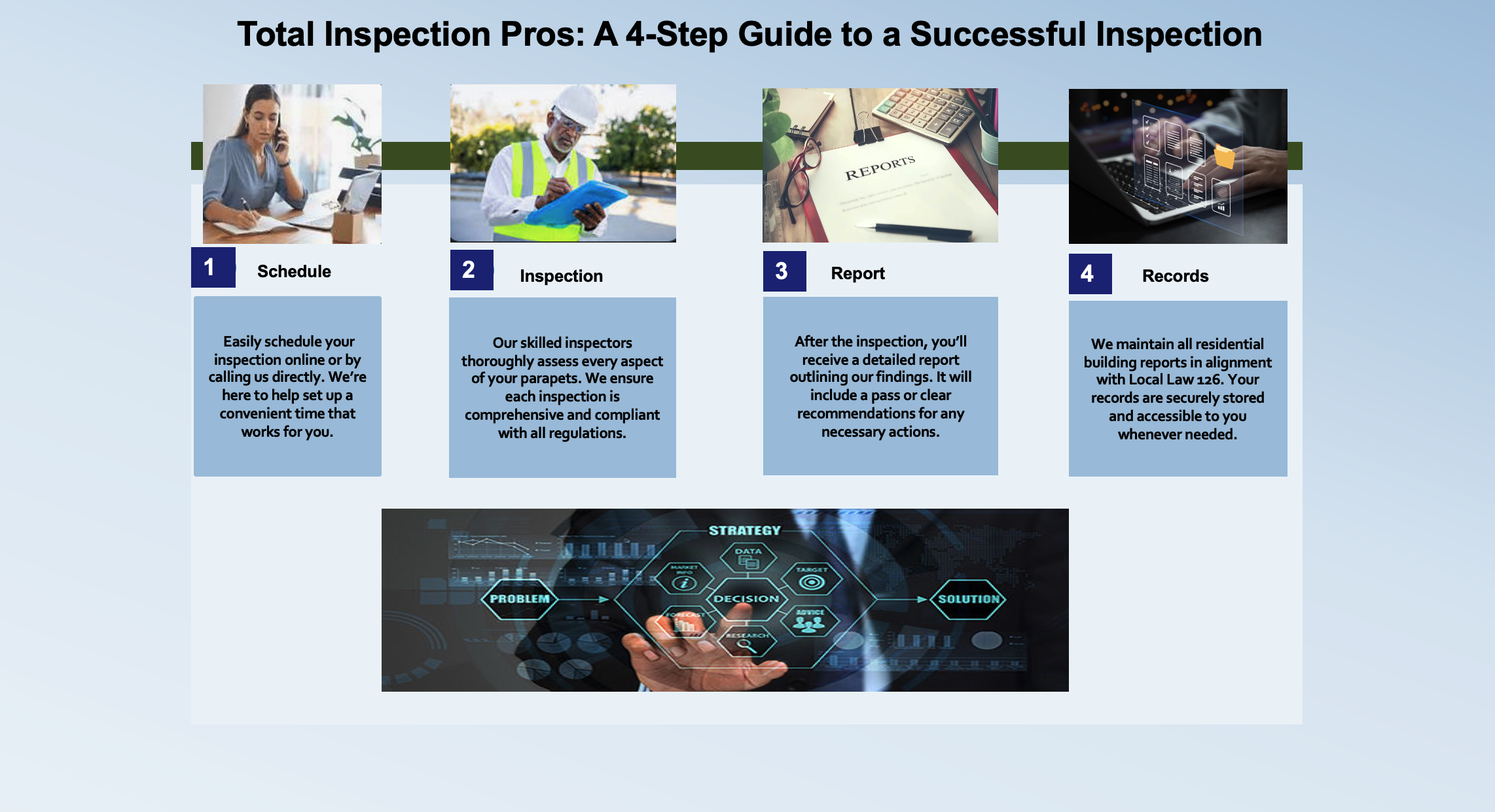 - At Total Inspection Pros, we specialize in parapet inspections, facade inspections, lead inspections, gas leak inspections, and HUD inspections, ensuring compliance with New York’s local laws.